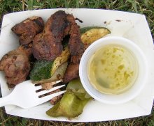 | Рецепт шашлыка из печени Ингредиенты: 450 г телячьей печенки 1/2 чайной ложки измельченного тмина 1/2 чайной ложки молотого горького перца 1/2 чайной ложки молотого сладкого красного перца 1/2 чайной ложки соли 225 г очищенных луковичек 8 ст. ложек растительного масла немного зелени петрушки ломтики лимона Способ приготовления: Печенку разрезать примерно на двадцать кусочков. Пряности перемешать с разогретым растительным маслом, добавить печенку и еще раз все старательно перемешать. На полчаса оставить. Затем нанизать на пруты, чередуя печенку и лук. Жарить над древесным углем в течение 10-20 минут, периодически поворачивая. Украсить зеленью петрушки и лимоном. В Египте, где распространен этот шашлык, нарезанную печенку сначала выдерживают в смеси всяких пряностей минут тридцать. Потом только жарят и подают с рисом. Шашлыки из печенки подаются в качестве закуски, но и как второе блюдо. Разумеется, не обязательно должна быть телячья печенка. Можна взять и куриную, которая готовится быстрее, а также говяжью, которую необходимо жарить дольше.